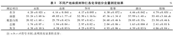 云南省6個地區麻瘋樹籽種仁中水分、油脂、蛋白質及灰分含量測定結果見表1。