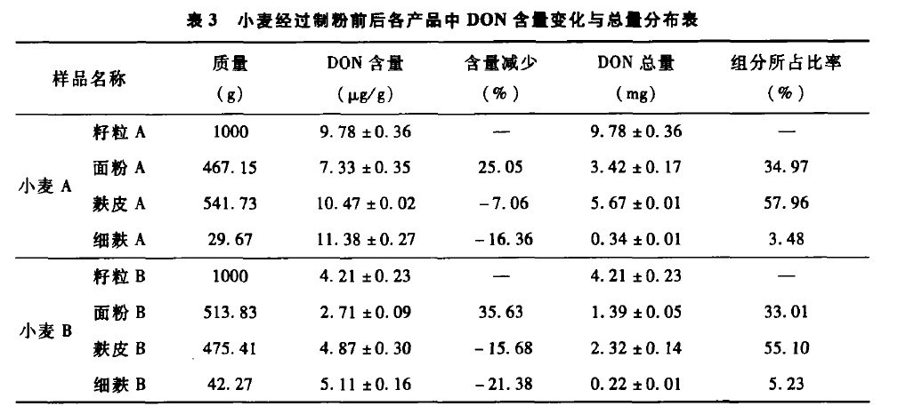 從表3可以看出:?測(cè)得小麥籽粒A、B中DON含量分別為9.78、4.21卜歲g,制得的面粉DON含量分別為7.33、2.71林歲g,相對(duì)小麥分別減少25.05%、35.63%.?數(shù)皮A、B的DON含量為分別為10.47、4.87卜歲g,細(xì)鼓A、B的DON含量分別為11.38、5.11卜歲g,均大于籽粒A、B中的DON含量。?小麥經(jīng)過制粉后,面粉A、B中的含有DON總量分別為原來籽粒中的34.97%和33.01%,而大部分集中在麥鼓和細(xì)教部分(共占61.44%和60.33%)。小麥A、B經(jīng)過制后所得面粉、麥鼓和細(xì)鼓的DON總量之和分別為小麥籽粒中DON總量的%.41%和93.34%.