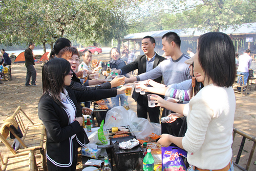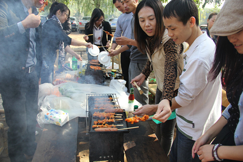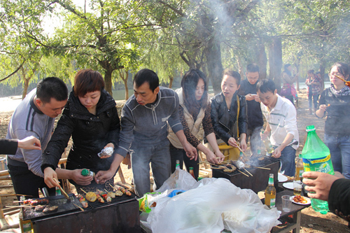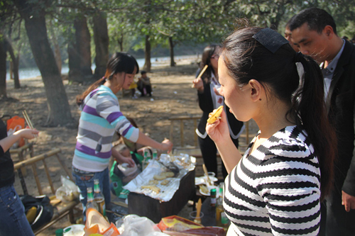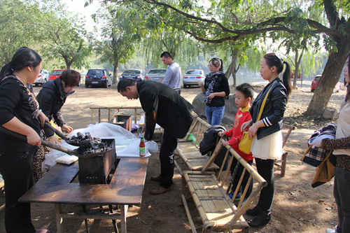 尋找好合適的場地,大家領著各自的任務便忙開了。男同事收拾燒烤攤,美食醬料一一擺放整齊;女同事洗菜切菜,快速而細致。大家邊忙著手里的活邊聊著天,共同享受著這樣一個閑適的周末時光。